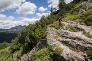 Direkt von Kreuth aus rollen wir heute los in Richtung Süd-Osten. Vorbei an den Schwaiger Alm zieht sich das Tal mit minimaler Steigung Kilometer für Kilometer den Berg hinauf. Knapp 8km und nicht einmal 400 Höhenmeter später, steht die erste kurze Pause an. Also Freund eher kurzer und dafür knackiger Anstiege bin ich froh, dass es ab jetzt „zu Fuß“ weitergeht. Die letzten 300 Höhenmeter tragen wir unsere Bikes. Wir nutzten den Aufstieg, um uns die ein oder andere Schlüsselstelle schon einmal genau einzuprägen, die Aufstiegsroute entspricht hier nämlich auch unserer Abfahrt.